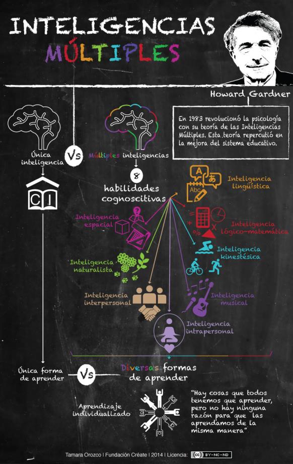 La teoría de las inteligencias múltiples es un modelo propuesto en un libro de 1983 por Howard Gardner en el que la inteligencia no es vista como algo unitario que agrupa diferentes capacidades específicas con distinto nivel de generalidad, sino como un conjunto de inteligencias múltiples, distintas y semi-independientes. Gardner define la inteligencia como la «capacidad mental de resolver problemas y/o elaborar productos que sean valiosos en una o más culturas». Vía wikipedia