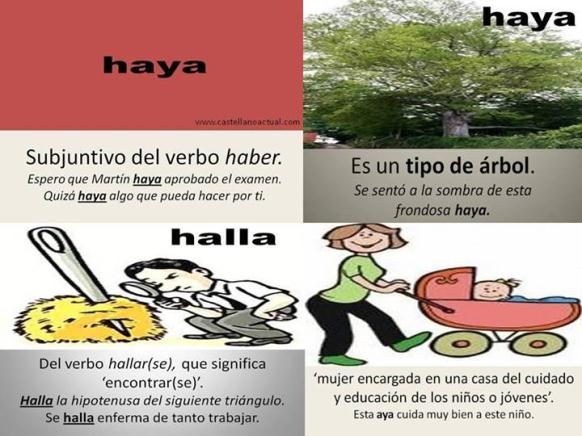 Imagen que ayudará a recordar cuándo hay que escribir haya (verbo haber o árbol), halla (verbo hallar) o aya (nana, niñera).